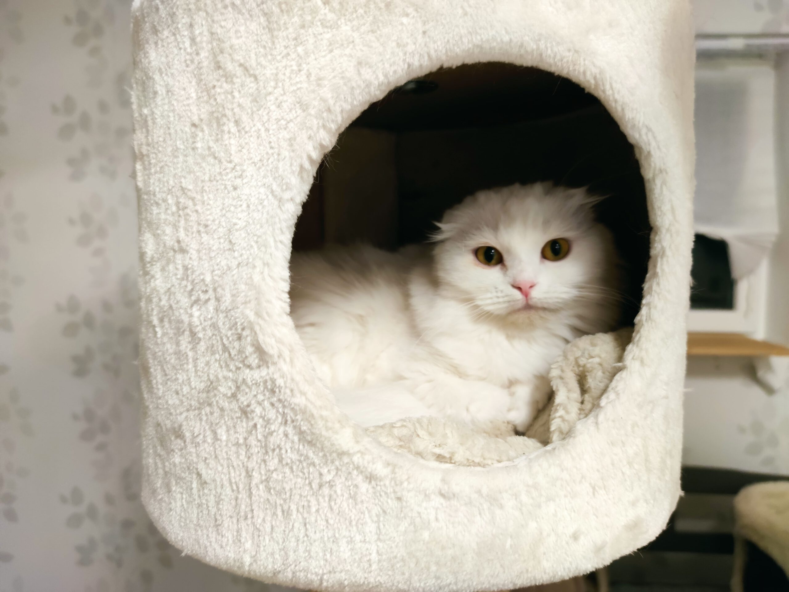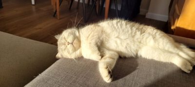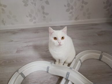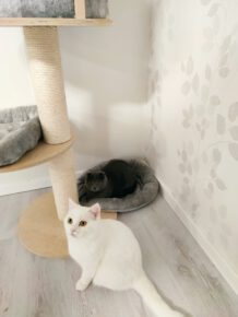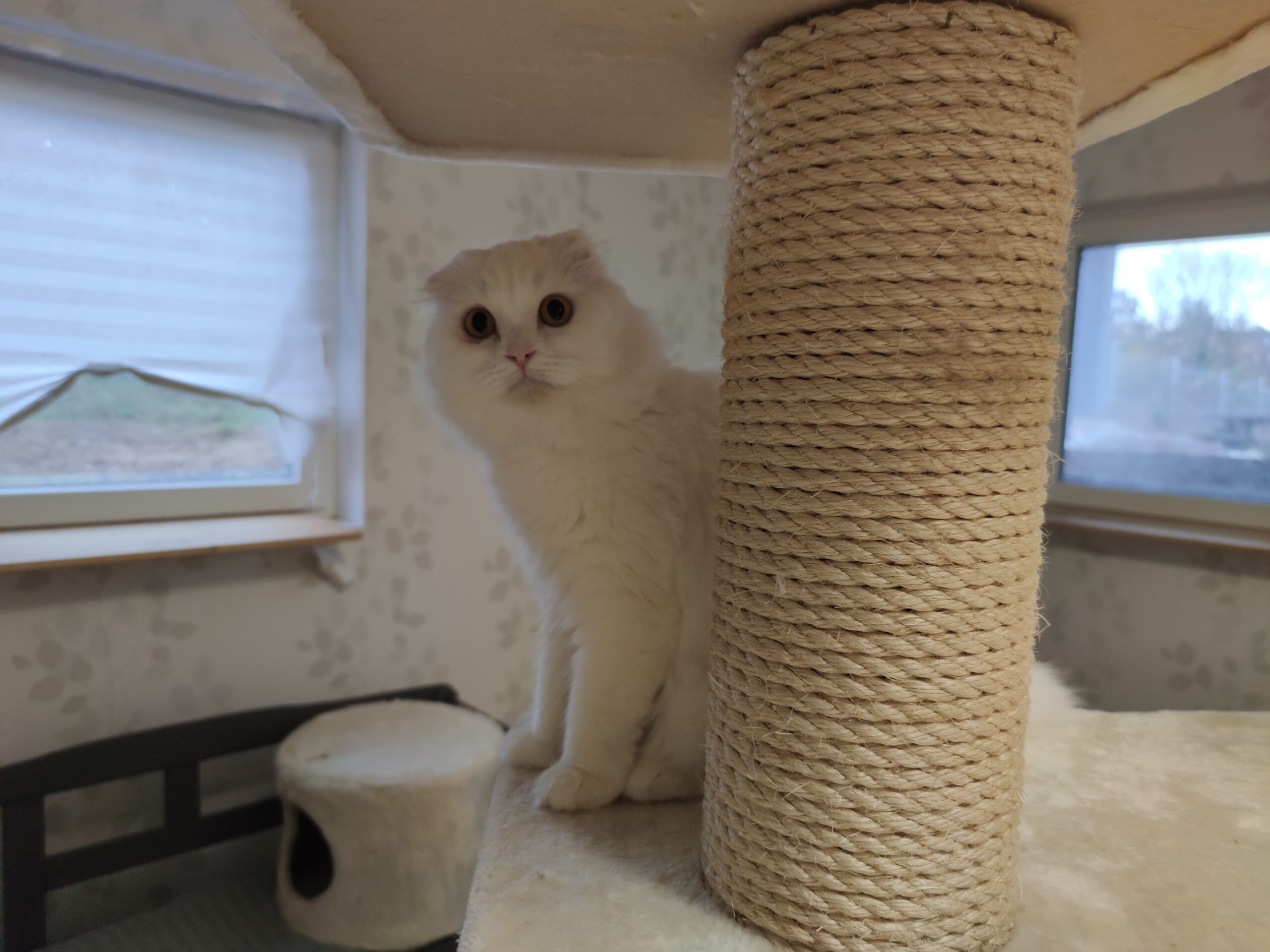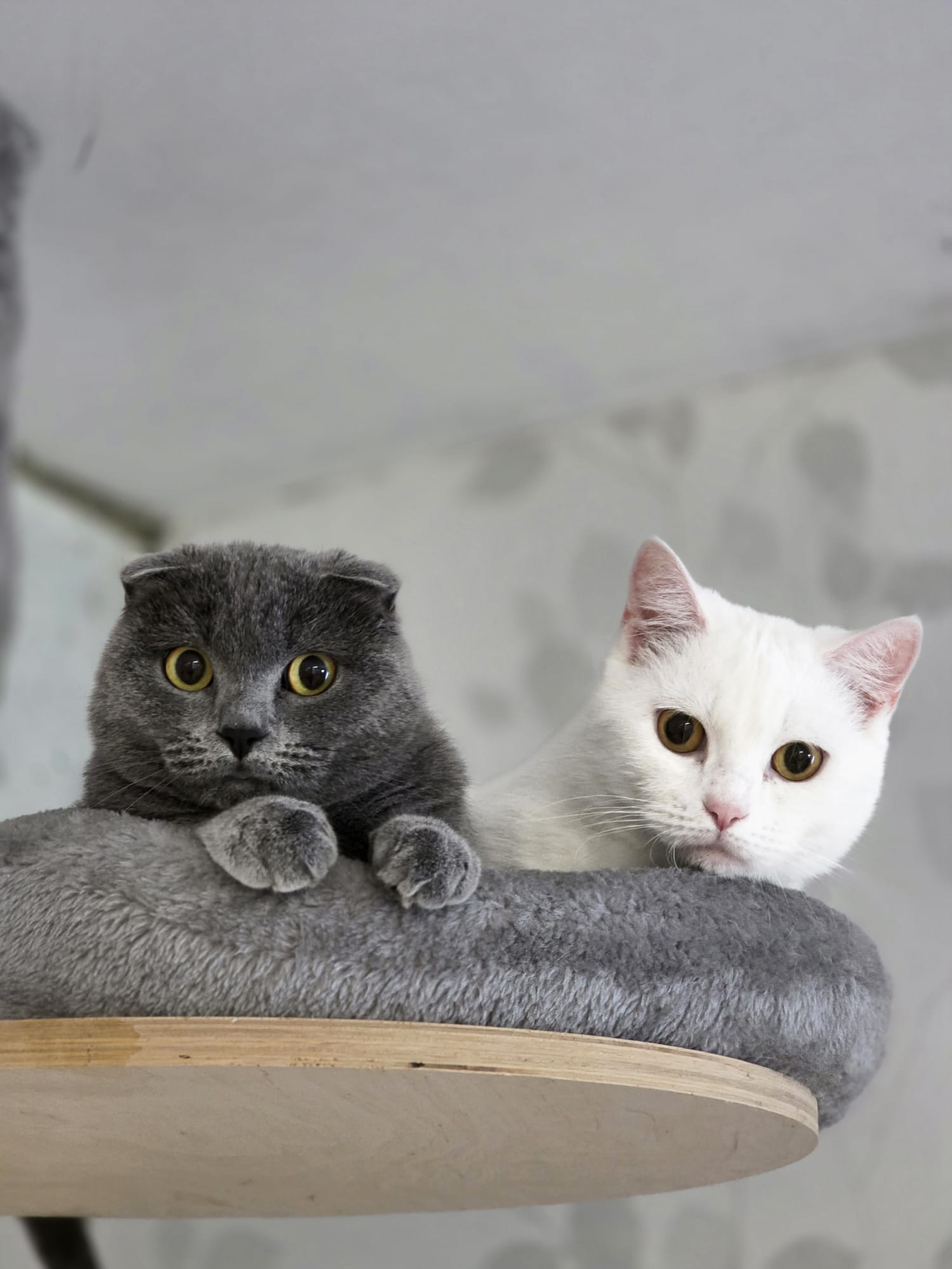Die schneeweißen Schwestern Anna und Elsa wurden geschätzt im Oktober 2024 geboren. Sie sind ein Mix aus Scottish Fold und EKH und machen fast alles gemeinsam. Spielen, Fressen, Kuscheln, selbst die Kastration haben sie zusammen gemeistert. Sie reagieren manchmal noch etwas unsicher auf neue Menschen, Geräusche oder Bewegungen, dies legt sich sehr schnell wieder.