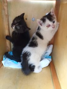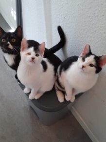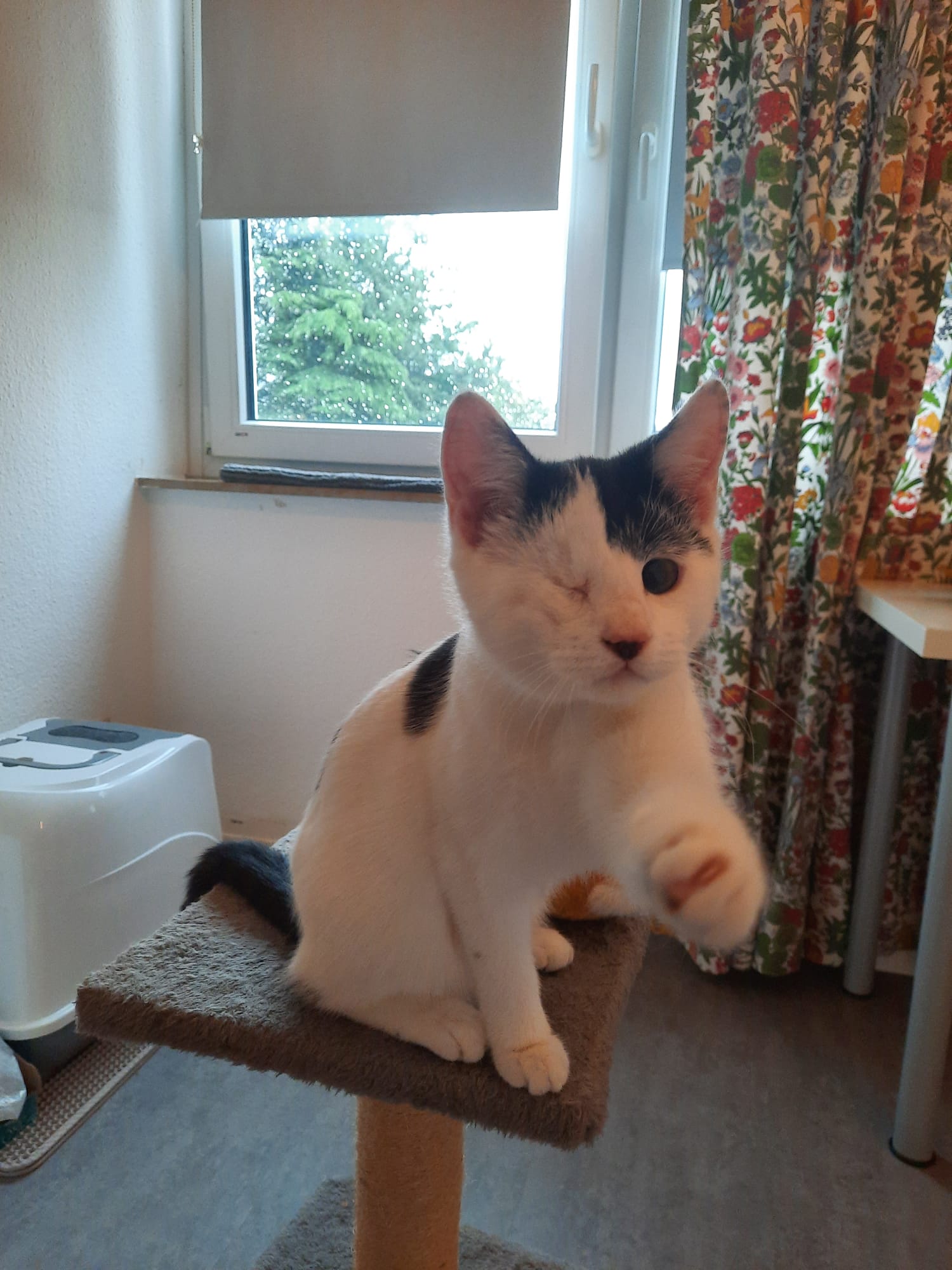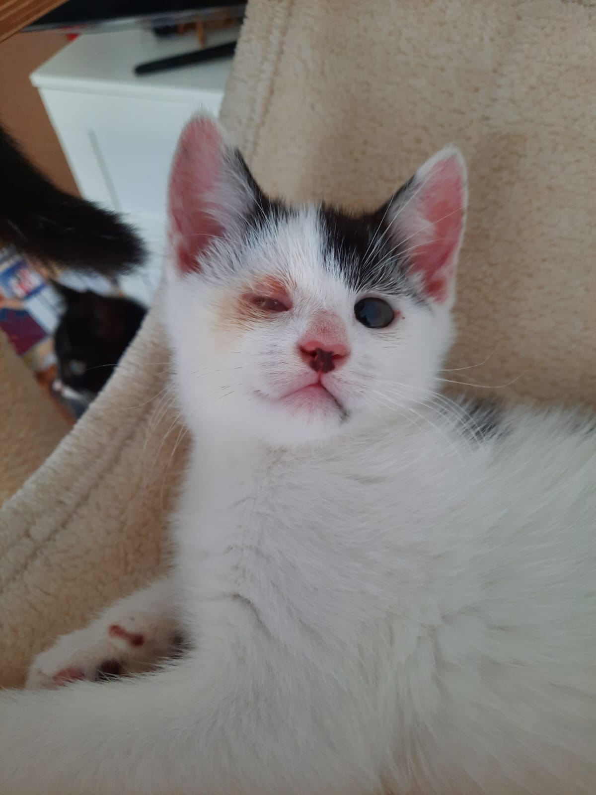 Die drei Kitten, alles Mädels, hatten Katzenschnupfen – so dachten wir. Die Versorgung der Augen brachte allerdings keinerlei Besserung, so dass wir sie zügig einem Spezialisten vorstellten. Das Ergebnis hat uns wirklich getroffen. Die beiden Kuhmädels, wir haben sie Betty und Bella genannt, haben Rolllider und keine Glaskörper in einem Auge, dieses Auge ist somit blind. Betty hat zudem auf dem anderen Auge einen grauen Star. Bei beiden musste jeweils das betroffene Auge entfernt werden, um ihnen ein schmerzfreies Leben zu ermöglichen. Ob Betty ihr vom grauen Star betroffenes Auge verlieren wird, ist noch nicht abzusehen. Bei weiteren Behandlungen stehen wir dem neuen Zuhause natürlich zur Seite, auch finanziell.